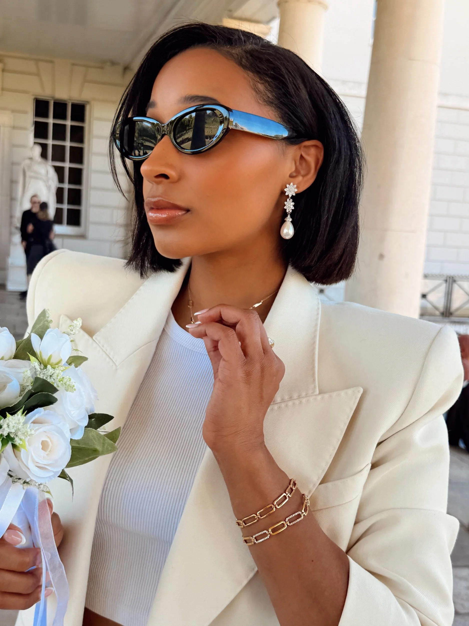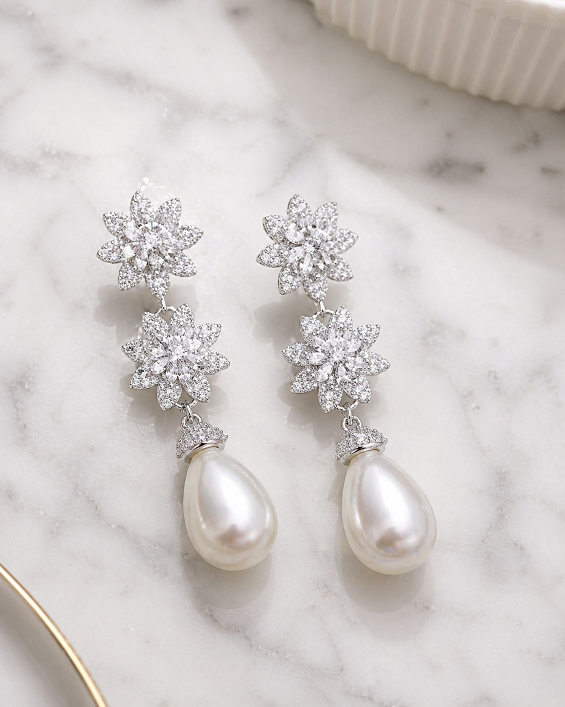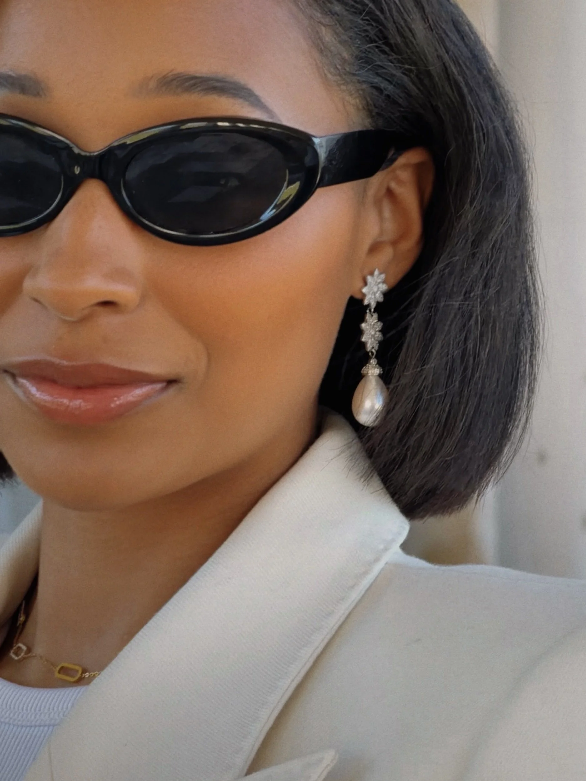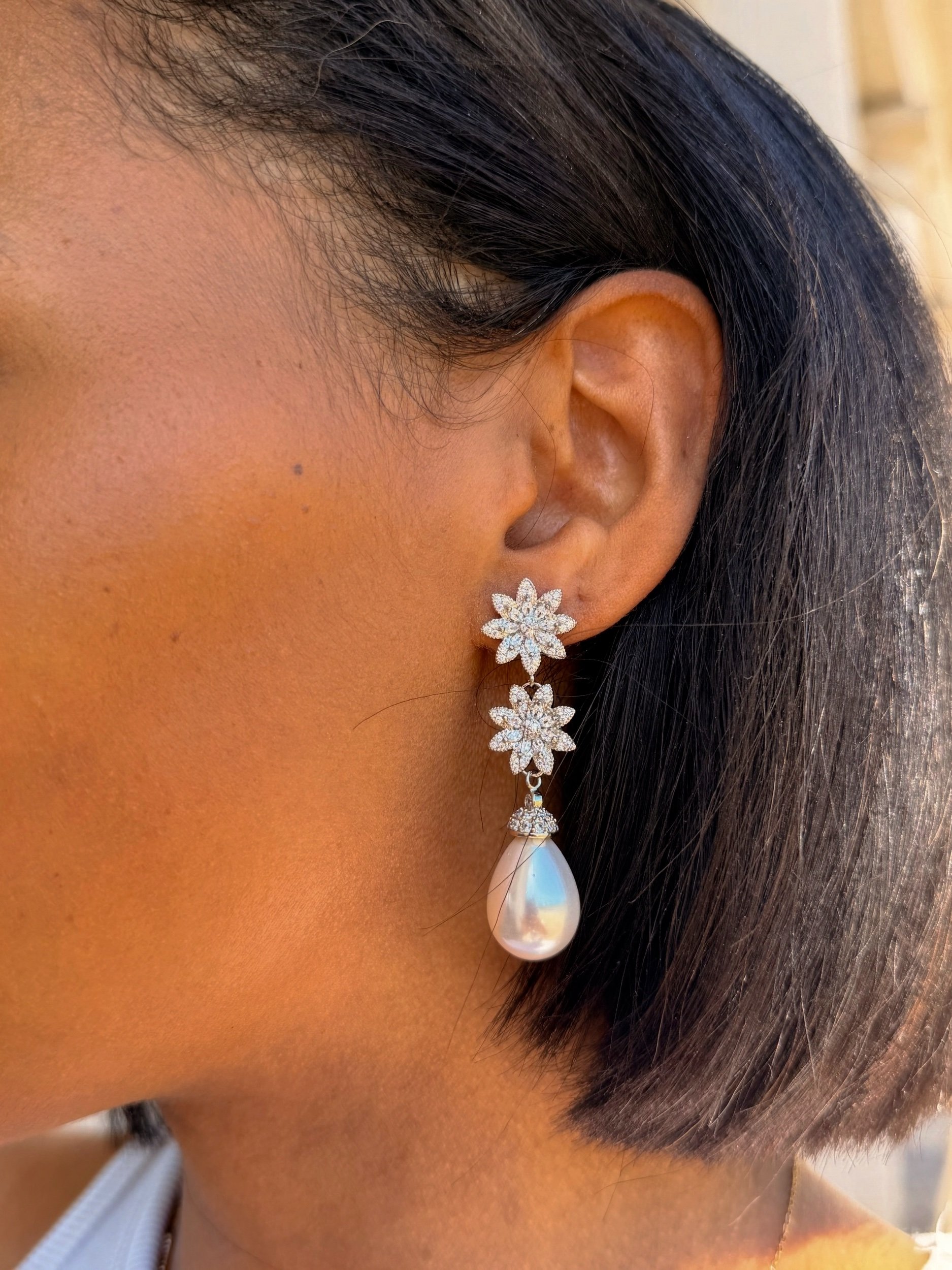 The Sade Pearl Drops make a statement without saying too much. A delicate floral cluster of cubic zirconia meets a soft pearl drop for effortless elegance.